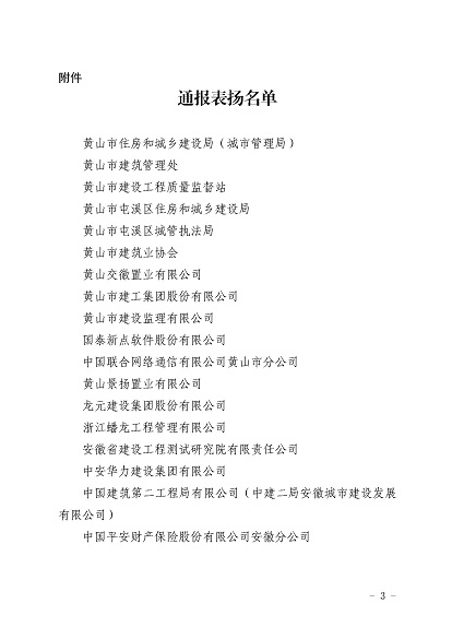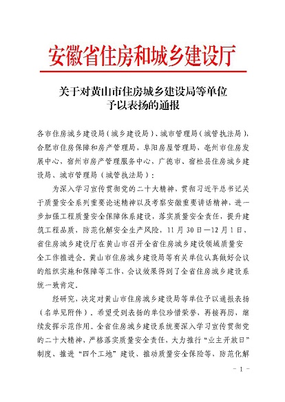 近日,安徽省住房和城乡建设厅印发《关于对黄山市住房和城乡建设局等单位予以表扬的通报》,《通报》指出,11月30日-12月1日,省住房和城乡建设厅在黄山市召开全省住房建设领域质量安全工作推进会,会议效果得到全省住房城乡建设系统一致肯定,并对在此次会议认真做好组织实施和保障的单位予以通报表扬,开云网页版-开云中国官方网站 作为唯一一家本土建筑施工企业荣获表扬。