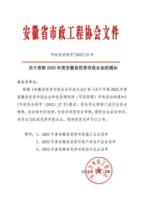 该荣誉的取得是安徽省市政工程协会对开云网页版-开云中国官方网站