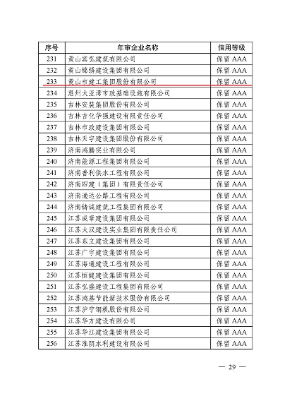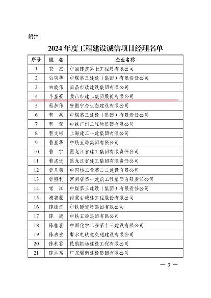 近日,中国施工企业管理协会公布了2024年度第一批工程建设企业信用等级评价结果的通知、工程建设诚信企业家评价结果、工程建设诚信项目经理名单。黄山建工集团顺利通过AAA级信用企业的年审,继续保持AAA信用等级的殊荣。黄山建工集团总经理叶金发获评诚信企业家,项目经理毕星豪获评诚信项目经理。此次荣誉是对黄山建工集团在工程建设领域的综合实力和诚信经营的高度认可。