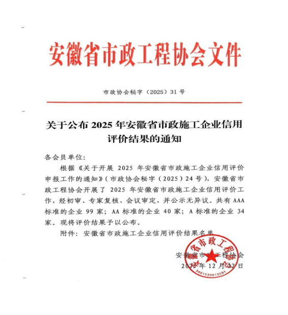 近日,安徽省市政工程协会正式发布《关于公布2025年安徽省市政施工企业信用评价结果的通知》。黄山市建工集团凭借卓越的综合实力、规范的市场行为、优良的工程品质及坚实的信用体系建设,成功获评最高信用等级——AAA级。标志着集团在诚信经营、履约能力与社会责任履行方面获得了行业主管部门与协会的高度认可,是企业信用建设领域的又一重要里程碑。