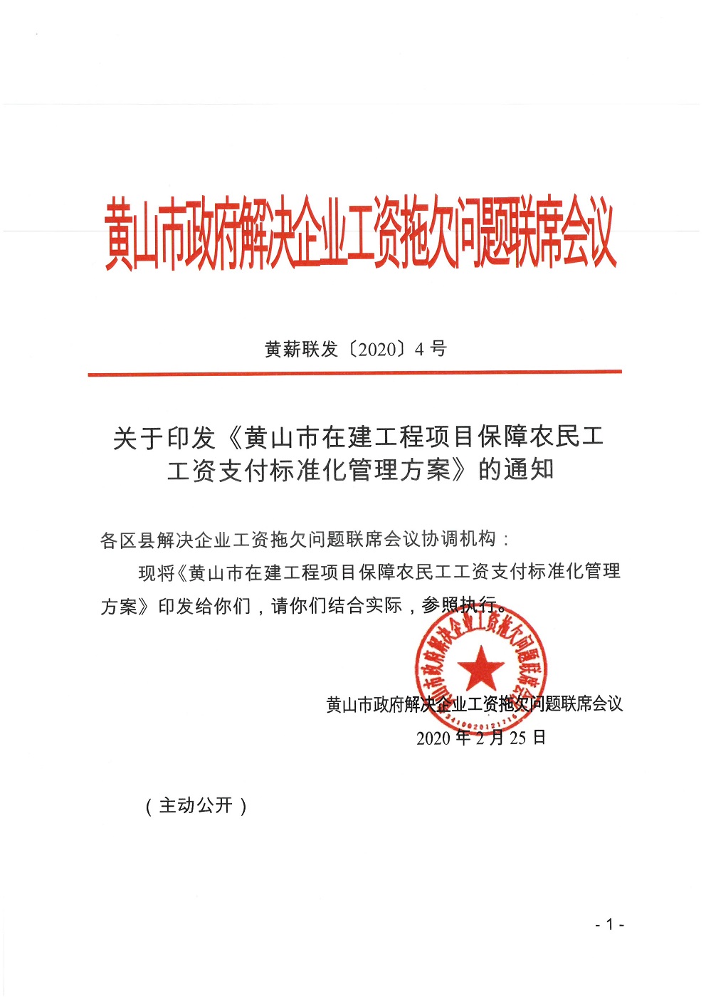 转发:关于印发《黄山市在建工程项目保障农民工工资支付标准化管理方案》的通知